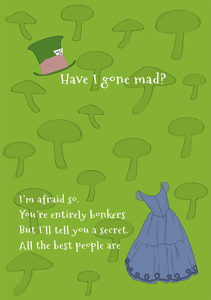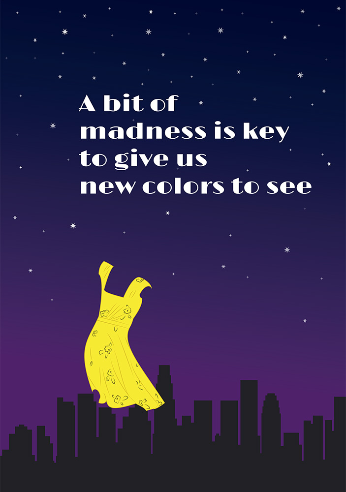 Formål Jeg havde i et stykke tid samlet ind på citater omkring “madness” i film og serier. Jeg fandt fra henholdsvis La La Land, Doctor Who og Alice i Eventyrland. Derfra var det at samle referencer og samle det til 3 plakater.